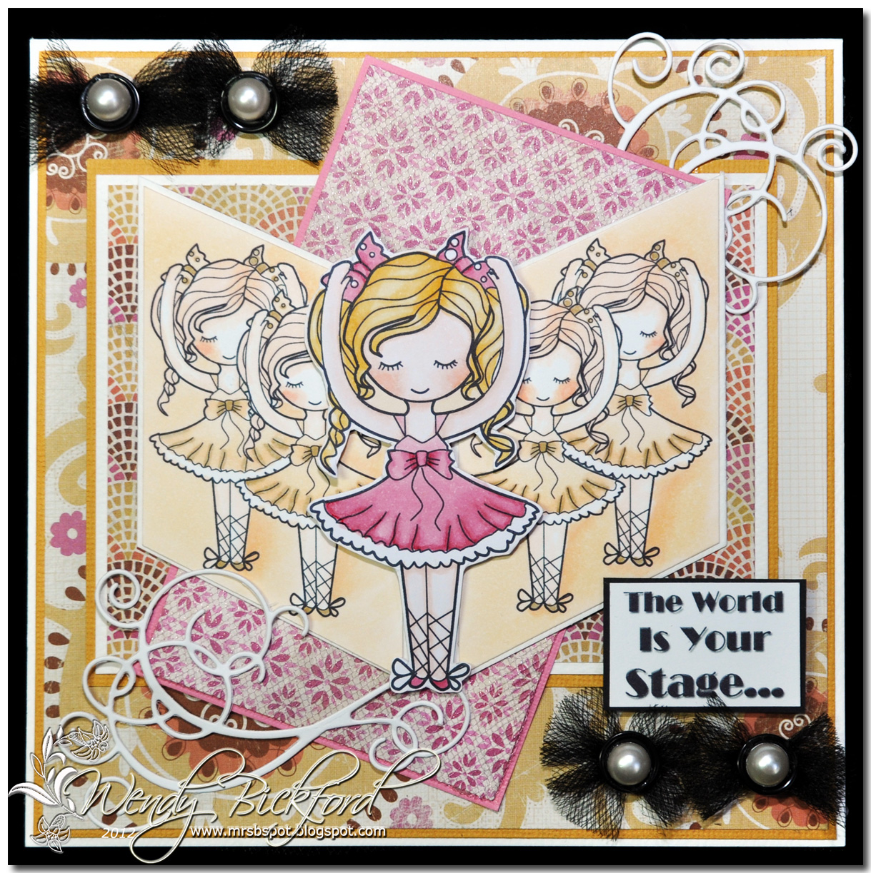 My precious 4 year-old granddaughter, Brooklyn, has her first ballet recital this weekend and this card is perfect for the occasion. I wanted to simulate Brooklyn as the Prima Ballerina with her ballet troupe, all colored up with Copic markers.